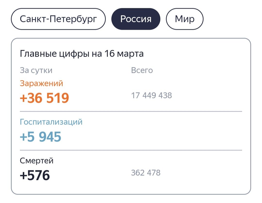 Наверное многие заметили, что где-то в 20 числах февраля информации о ковид стало все меньше в новостных програмах, в рекламе меньше стали призывать вакцинироваться. По городам меньше висит плакатов о важности сделать вакцинацию и спасти себе жизнь. Кажется, что коронавирус начал терять свою актуальность в России. Особенно контрастно это выглядит на фоне введённых повсеместно QR-кодов в начале января 2022года.