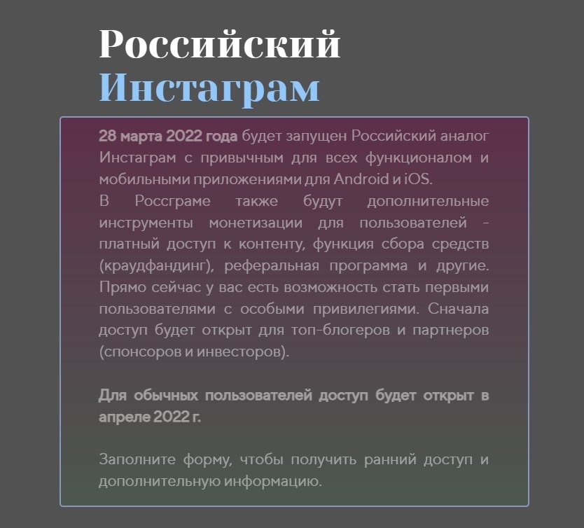 Активно обсуждаемая, потенциально возможная площадка. И да, этот блог совсем-совсем не про новости социальных сетей, однако у меня две причины, чтобы отметить это явление. Я, как публичная личность, сейчас сам нахожусь в активном поиске площадки для своих мероприятий. Меня, как человека, который часть жизни отдал сфере безопасности, довольно сильно смущает как началась эта история с Россграмом. Прямо несколько звоночков одновременно. Перечислю, что я имею в виду. Сейчас идеальное время для того, чтобы запустить историю, которая способна затмить собой МММ. Представьте: миллионы обезумевших от невозможности постить фоточки и листать ленту людей, получают обещание, что совсем скоро они обретут то самое, что всегда имели. Только лучше. И первыми получат доступ инвесторы и топ-блогеры. Очень -очень многие захотят быть первыми, потому что это возможность сделать первые посты и получить первых подписчиков. Все же «знают», что тот, кто первый, тот имеет больше возможностей ст
