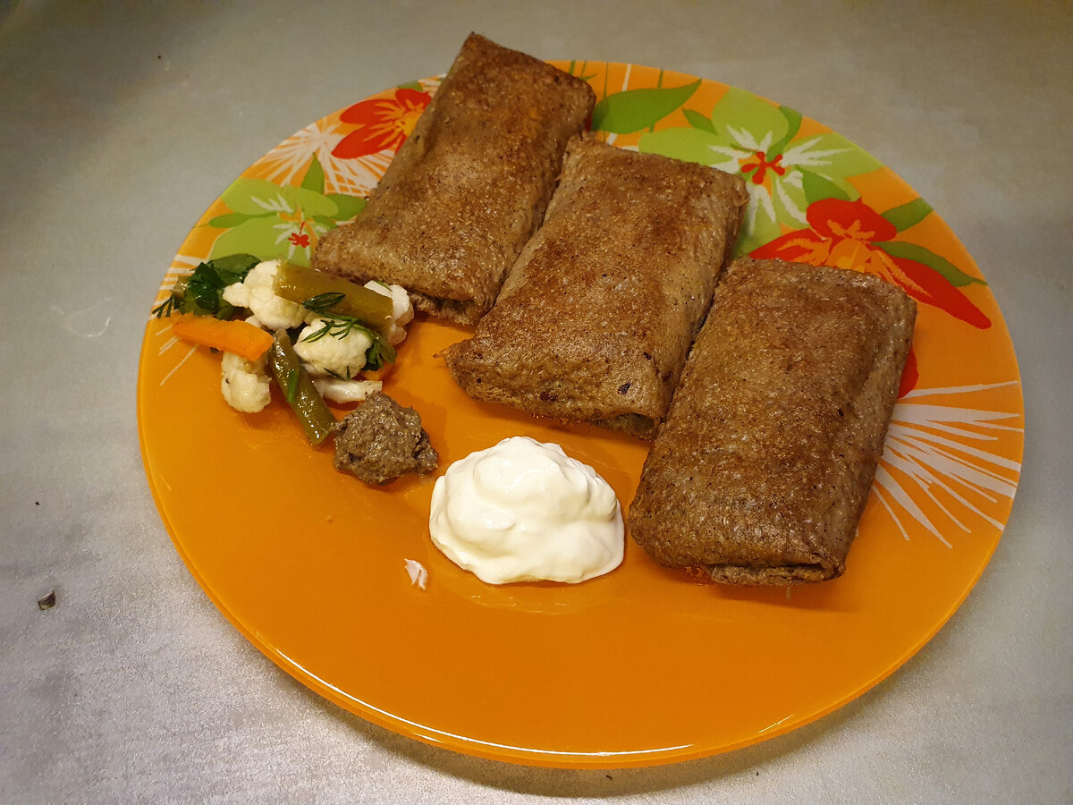 Если масленица прошла, а вы блинов так и не наелись – кто сказал, что их нельзя печь в другое время? 😉 Моя диета исключает добавленную соль, рафинированную муку и ограничивает сахар, поэтому все публикуемые рецепты соответствуют этим моими потребностями. Вооружаемся мисками-поварешками и айда на кухню! Сегодня на ужин блины с начинкой из маша карри. Заранее приготовим начинку. Две горсти маша (1 горсть = 1порция) заранее замочим в воде на ночь, затем отварим до готовности. Обжарим морковь с репчатым луком, чесноком, свежим чили и имбирем (количество вариативно). Смешаем маш с поджаркой, добавим приправу карри (я составляю ее сама, спрашивайте в комментариях – расскажу как). Немного пробьем смесь блендером для вязкости. Для теста возьмем 3/4ст муки из зеленой гречки (обычной гречневой заменить не выйдет), 1/4ст ржаной муки, 1ст.л кукурузного крахмала, 1 яйцо, 1ст.л растительного масла, воды (или молока) - сколько потребуется до желаемой консистенции (никогда не измеряю). Если в блинчи