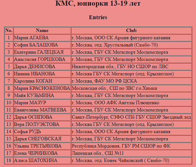 Сегодня в Москве проходит сразу два турнира один - первенство ГБУ СК "Мегаспорт" "Памяти И.С. Русакова" для фигуристов младшего возраста, и второй - всероссийские соревнования "Памяти И.С. Русакова" для спортсменов выступающих по КМС и МС. Наибольший интерес вызывает именно всероссийский турнир в котором примут участие фигуристы из академии "Ангелы Плющенко". Предлагаю ознакомиться со списком участников. У девушек по категории КМС в турнире примут участие такие фигуристки как Каролина Коган и Мария Мазур. У юниоров в списках участников присутствуют Максим Автушенко и Никита Сарновский. Пары: Танцы: По мастерам спорта у женщин заявлена владеющая ультра-си элементами Анастасия Зинина. У мужчин стоит как минимум посмотреть на выступления Марка Лукина, Никиты Сенцова, Кирилла Андрусика и Кирилла Сарновского. А в парах по мастерам спорта планируют выступить Алина Пепелева и Роман Плешков. Расписание: 16 марта 17 марта 18 марта Ссылка на трансляцию 16.03: