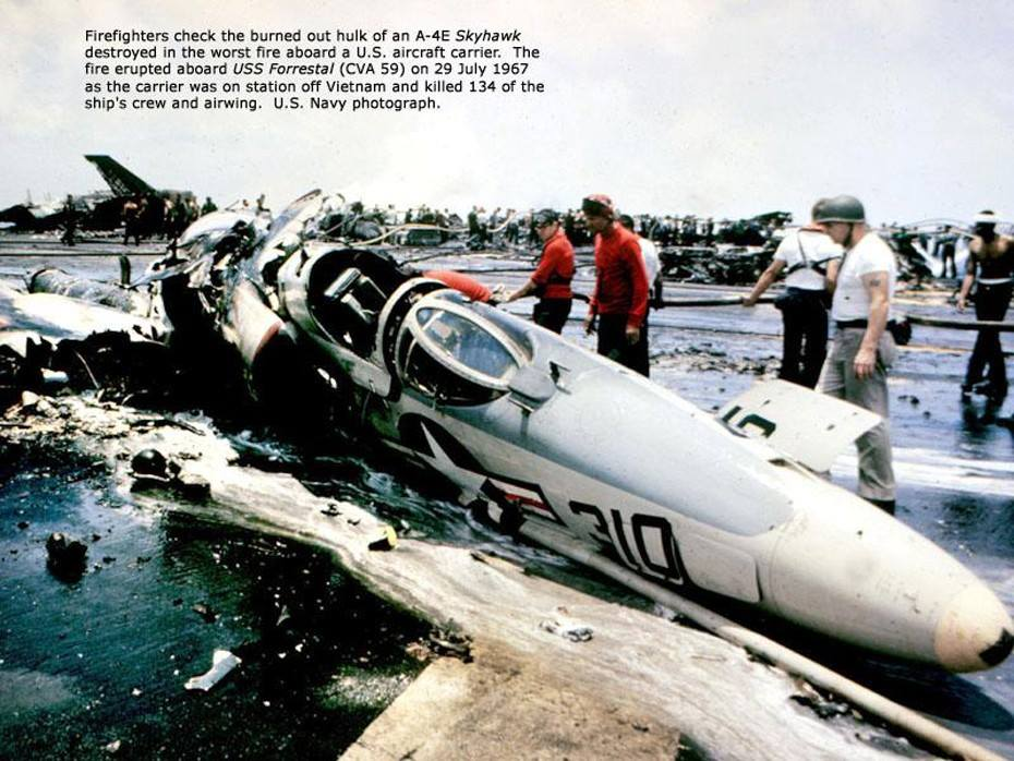 В 4 утра следующего дня, через 17 часов кошмара, удаётся победить огонь во чреве корабля. USS Forrestal, усталый и изуродованный, возвращается домой, побыстрее уматывая от берегов Северного Вьетнама в сторону Филиппин со скоростью 25 узлов. Более 134 человека мертвы, ожоги и ранения у 161 членов команды, уничтожен 21 самолет, на 4 месяца грозный авианосец превратился в безобидную баржу.