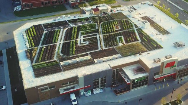 Огороды на крышах домов не новость. Они есть в разных городах и странах. Но вот идея одного из супермаркетов в Канаде стала в определенной мере новаторской. Супермаркет IGA Extra Famille из города Дюшемин разбил огород на своей крыше площадью 2300 квадратных метров. И выращивает там 35 видов овощей, фруктов, цветов и реализует их сразу под крышей своего же магазина. Супермаркет самостоятельно производит и продает капусту, салат, морковь, зеленую фасоль, баклажаны, чеснок, помидоры и шпинат. А еще в огороде на крыше есть ульи для сбора меда, который тоже продают буквально "этажом ниже". Огород даже спроектирован в форме логотипа супермаркета IGA, что очень красиво смотрится с воздуха :) А вот так огород на крыше выглядит уже с уровня самой крыши. Огород не только выращивает еду, он еще использует для полива конденсат, который образуется в системе кондиционирования магазина. И является домом для птиц и пчел :) Рассмотренный пример из Канады крайне важен, если мы хотим обсуждать вопро