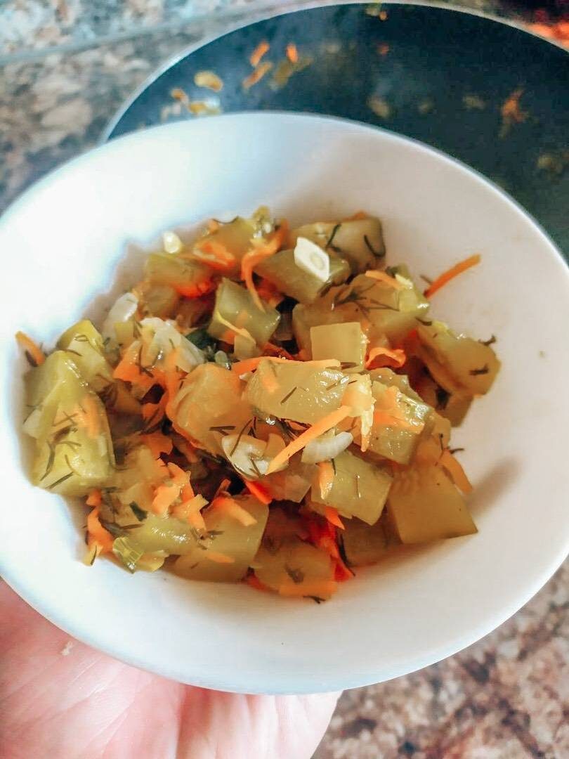Ингредиенты: кабачков, лука, моркови, чеснока, укропа, соль, специи (молотый перец, лавровый лист), растительного масла, лимонного сока, сахара