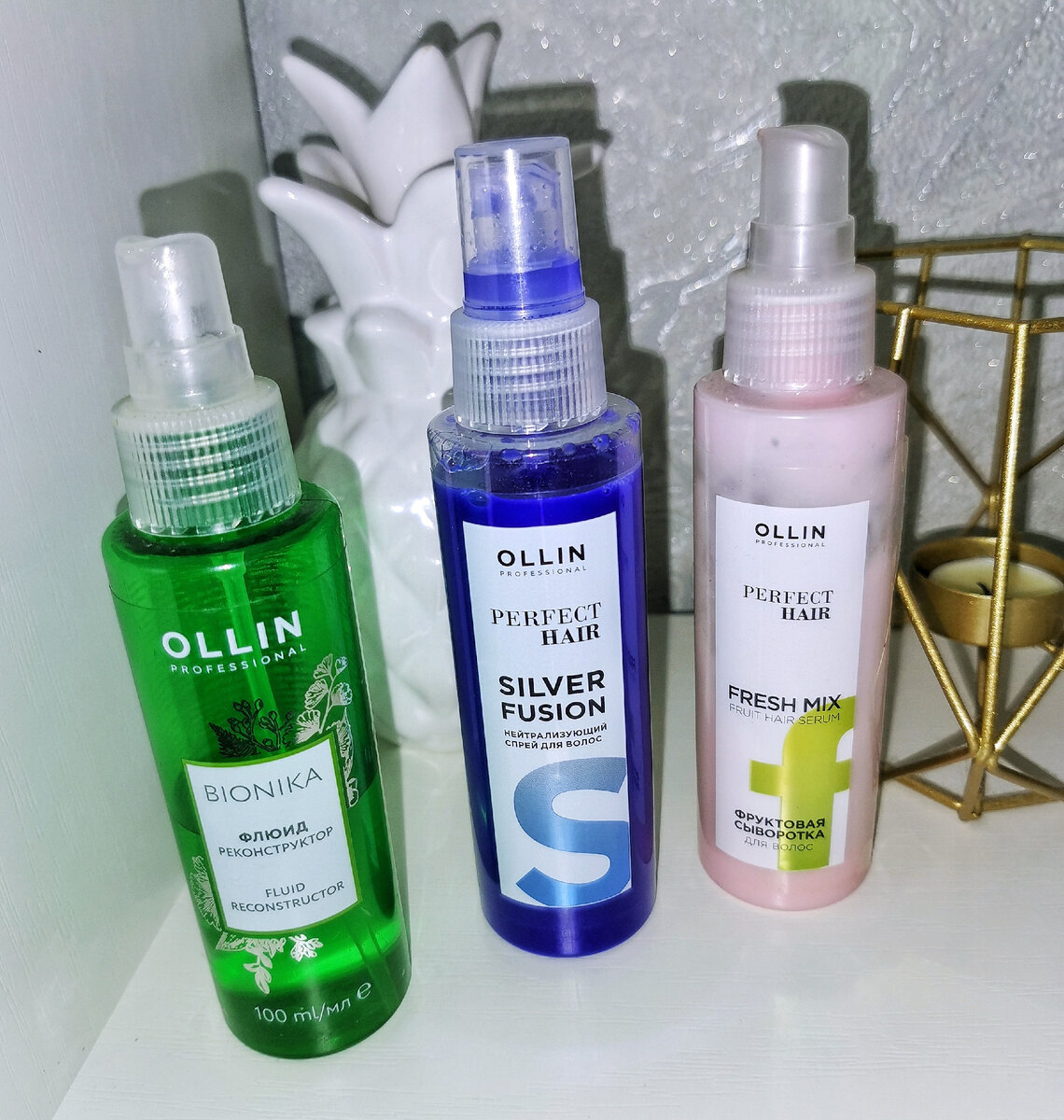 Всем привет! Хочу рассказать о моих бюджетных находках "несмывашек" для волос, которые продаются в свободном доступе и всегда можно купить либо заказать online Все эти средства от марки Ollin, мне данная марка нравится и средства отлично подходят для моих волос, хотя стоят довольно бюджетно. Начну вот с такого нейтрализующего желтизну спрея для волос. Аромат очень приятный. Перед примением обязательно встряхнуть. Наносить на влажные волосы, можно на всю длину либо на отдельные осветленные пряди. Со своей задачей отлично справляется, хотя при покупке не возлагала на него какие-то надежды, подобным спреем пользуюсь впервые, обычно использовала фиолетовые шампуни либо бальзамы. Стоит он около 200 рублей. Следующее средство это фруктовая сыворотка. Также наношу на слегка подсушенные полотенцем волосы. Аромат приятный, как и у всех уходовых средств для волос. Хорошо увлажняет волосы и подготавливает к дальнейшей укладке. Цена ее рублей 150. И последнее, это очень классный флюид реконструкт