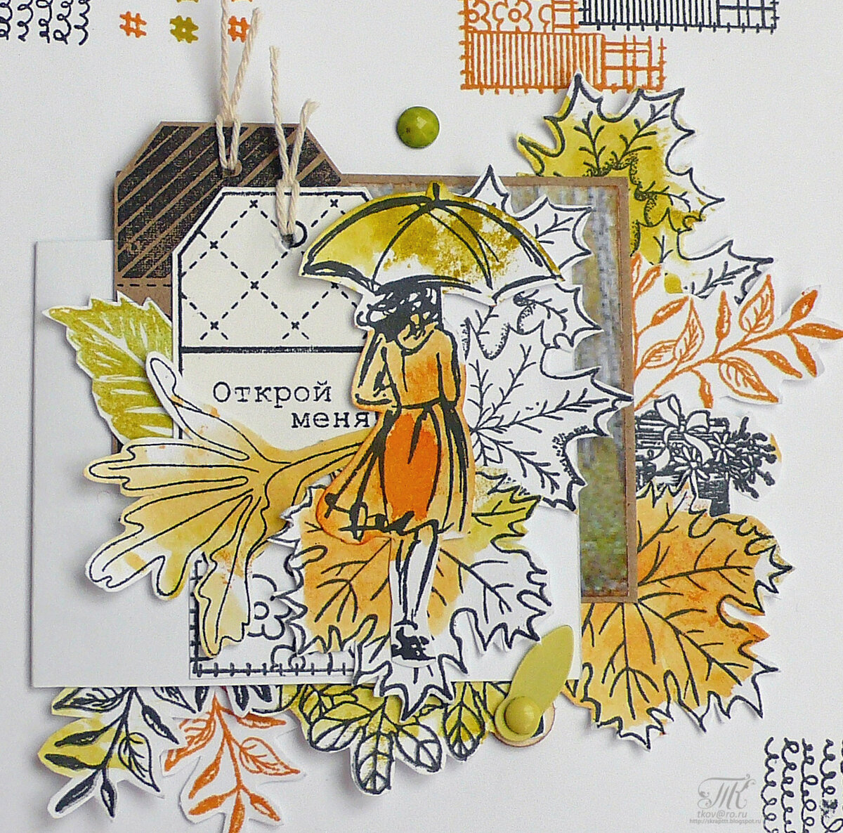 Вот такая она, моя осень: только штампы и крафт и ватман. И ни единого листочка скрапбумаги! Первый разворот Второй разворот Третий разворот Для декора использовала граненные камушки и чипборд набор "Листья". Чипборд кроме декоративной функции на страницах альбома выполняет еще и функцию "выравнивающую": я его расположила в таких местах, чтобы выровнять зазор между страницами. Видите, альбомчик ровненький, расстояние между страницами одинаковое