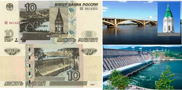В настоящее время в России находятся в обращении банкноты достоинством 5₽ (с видами Новгорода Великого), 10₽ (Красноярск), 50₽ (Санкт-Петербург), 100₽ (Москва), 500₽ (Архангельск), 1000₽ (Ярославль) и 5000₽ (Хабаровск). Кроме того, в 2014 году в обращение была выпущена «олимпийская» купюра достоинством 100₽ с видами спортивных объектов в Сочи, а в 2015-м — посвященная присоединению Крыма к России сторублевка с видами Севастополя. В 2017 были выпущены купюры достоинством 200₽ (Крым) и 2000₽ (Владивосток). В 2018 году к чемпионату мира по футболу выпустили памятную купюру номиналом 100₽. (Купюры в 5₽ и 10₽ уже практически не встречаются, так как заменены монетами). Так что же изображено на российских современных банкнотах? 10 рублей: Красноярск Сегодня 10 рублей — наименьшая купюра в российской денежной системе. На ней вы можете увидеть изображение Красноярска. На лицевой части купюры показаны часовня Параскевы Пятницы (святой, покровительницы семьи и домашних животных) и мост через Енис