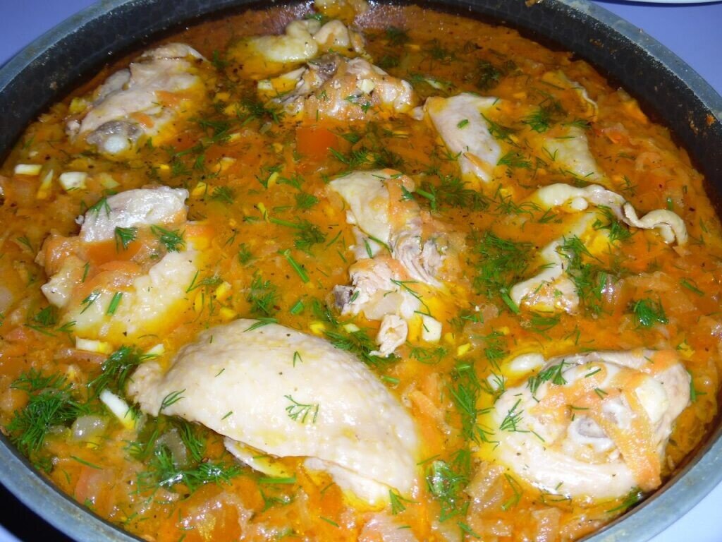 Добрый вечер,дорогие мои друзья!!! Вечная проблема большинства хозяюшек -что приготовить на ужин, чтоб вся семья была сыта и довольна. Делюсь рецептиком: КУРИЦА С ОВОЩНОЙ ПОДЛИВОЙ Ингредиенты: Курица — 1 кг Морковь — 1 шт. Лук — 1 шт. Помидор — 2 шт. Томатная паста или кетчуп — 2 ст.л. Чеснок — 4 зубчика. Вода — 250 мл. Укроп, специи и соль по вкусу. Приготовление: Нарезаем лук кубиками, натираем морковь на крупной терке, обжариваем овощи до мягкости в растительном масле или на жиру. Курицу нарезаем на порционные куски и добавляем к овощам, обжариваем с двух сторон по 5-7 минут. Добавляем порезанные кубиками помидоры и тушим, накрыв крышкой 5 минут. Томатную пасту размешиваем с водой и вливаем ее к курице с овощами. Тушим под крышкой минут 20 на среднем огне, периодически переворачивая. Солим по вкусу и приправляем специями, добавляем измельченную зелень и укроп. На гарнир приготовим картофельное пюре или гречку, рис. Приятного аппетита!