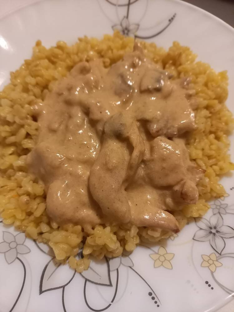 Фрикасе из курицы с шампиньонами и булгуром на гарнир