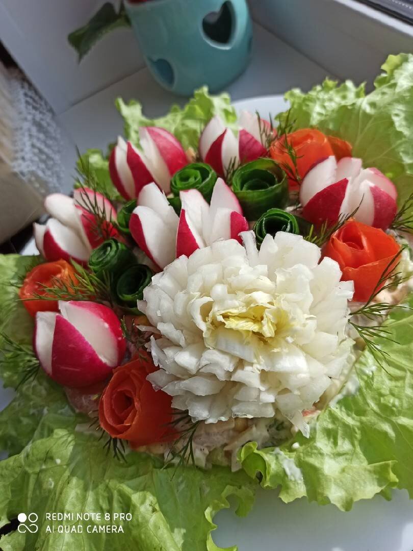 #салат #красиваяподачаблюд #цветыизовощей Ингредиенты: Свинина (говядина), Яйца, Помидоры (твёрдых сортов), Огурцы, Сыр, Кукуруза консервированная, Зелёный лук, Соль, перец, Майонез Способ приготовления: Мясо, яйца отварить. Нарезать соломкой. Точно также нарезаем сыр, огурец и помидоры. Лук зелёный помыть, нарезать. Можно заменить репчатым. Всё смешать, посолить, поперчить. Заправить майонезом. Готово! Для красивой подачи использовала кольцо. И, конечно, украсила цветами! Весна ведь😊! Обязательно попробуйте! Не бойтесь тратить своё время на красивую подачу! Ведь ваши старания обязательно оценятся по достоинству вашими близкими... уж это я вам точно говорю😘!