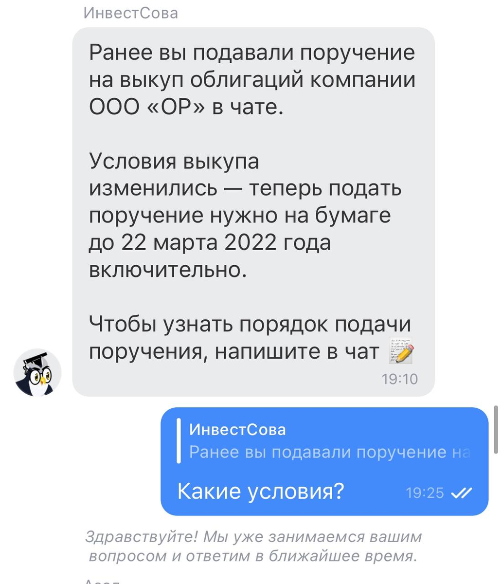 15 марта то от брокера Тинькофф в чате пришло вот такое вот сообщение: Ранее я подавал облигации на оферту через чат, подписывая эти поручения SMS кодом Поддержка брокера: Чтобы поучаствовать в выкупе, нужно подать нам бумажное поручение до 22 марта 2022 года включительно. Я: Какое поручение (где взять форму) и как его подать? Поддержка брокера: Чтобы подать поручение на досрочное погашение облигаций эмитентом, нужно: Назначить встречу в офисе Подписать поручение на встрече в офисе Тинькофф по адресу г. Москва, ул. 2-я Хуторская, 38А, стр.26 (БЦ «Мирленд»). Подписать поручения нужно в присутствии представителя банка. Заранее подписывать не нужно. Для этого необходимо заранее назначить встречу с представителем в офисе, что бы это сделать необходимо нам позвонить или написать в чате. Крайний срок назначения встречи должен быть за 1 рабочий день до крайней даты приема поручения по КД. Другой вариант — заверить поручение у нотариуса и отправить его по почте. Нужно учитывать срок доставки