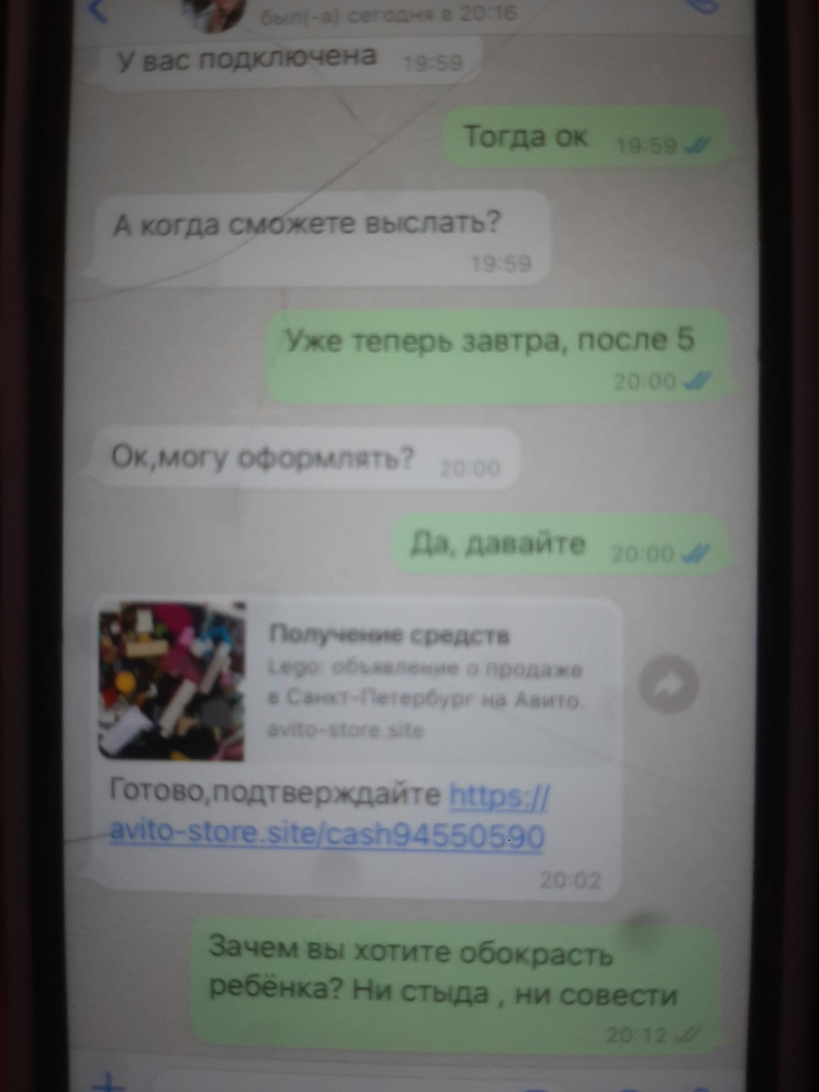 Дочь в приложение Авито выложила на продажу целый контейнер оригинального Лего Фрэндс на продажу за 5000 руб. Через некоторое время ей в ватсап пишет девушка (по крайней мере по фото). Мол с другого города, можем ли выслать. Мы согласились. И она говорит, сейчас оформлю сделку, а именно произведёт оплату на авито. Через пару минут приходит от неё ссылка, так же в ватсап с просьбой подтверждения получения денег. Мы проходим по ней, там просят ввести данные карты, а потом самое интересное, выходит окошко для подтверждения ОПЛАТЫ ПОКУПКИ В МАГАЗИНЕ на сумму 5075 руб. Я напряглась и стала экстренно искать как правильно проходит безопасная сделка на авито. Там описано, что сообщение приходит в приложение, при этом с кодом для отправки, ни слова про какие-то ввода данных карты. Если бы это делал ребёнок, то думаю все денежные средства были бы сняты с карты, а так, я просто отменила все действия. Не проходите по ссылке такой как https://avito-store.site/.... это сайты близнецы! Будьте осторо