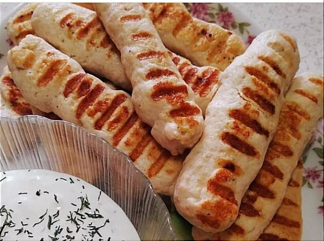 Вкусные колбаски! Можно использовать любимые специи. Ингредиенты: - куриное филе, - сливки или молоко, - яйцо, - кукурузный крахмал, чеснока, - паприка(с горкой), Соль, перец , Растительное масло для жарки (смазывания сковородки), Для соуса:, - сметана, - горчица, чеснока, Соль, перец и свежая зелень укропа Способ приготовления: Нарезать куриное филе небольшими кусочками. Загрузить в блендер все ингредиенты и измельчить. Выложить фарш в кондитерский мешочек. Можно просто в полиэтиленовый пакет, отрезать кончик. Сковороду - гриль (можно и обычную) нагреть, смазать растительным маслом и отсадить из мешочка колбаски. Жарить на среднем огне под крышкой по 3-4 минуты с двух сторон. Подать с соусом и овощами. 😋 Приятного аппетита! 🌹
