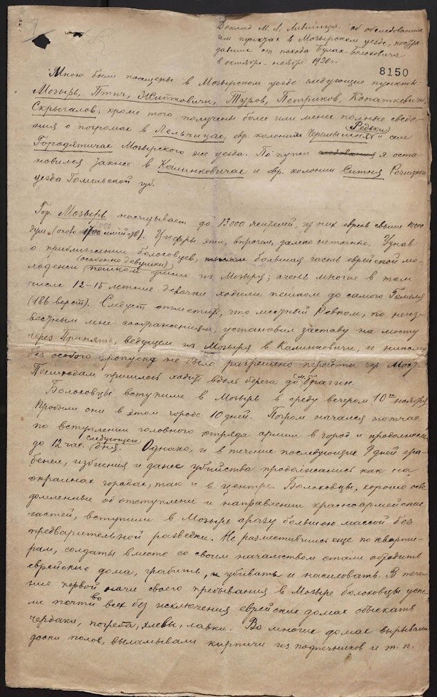 Балаховцы вступили в Мозырь в среду вечером 10-го ноября. Пробыли они в этом городе 10 дней. Погром начался тотчас по вступлении головного отряда армии в город и продолжался до 12 час. следующего дня. Однако и в течение последующих 9 дней грабежи, избиения и даже убийства продолжались как на окраинах города, так и в центре. Балаховцы, хорошо осведомленные об отступлении и направлении красноармейских частей, вступили в Мозырь сразу большой массой без предварительной разведки. Не разместившись еще по квартирам, солдаты вместе со своим начальством стали обходить еврейские дома, грабить, убивать и насиловать. В течение первой ночи своего пребывания в Мозыре балаховцы успели почти во всех без исключения еврейских домах обыскать чердаки, погреба, хлевы, лавки. Во многих домах вырывали доски полов, выламывали кирпичи из подпечников и т.п. В эту ночь было убито 18 чел., в течение остальных 9 дней было убито и умерло от ран еще 14 чел. Всего в Мозыре и непосредственно прилежащих окраинах города (Трипуны и Кимбры) убито было 32 человека. Число изнасилованных женщин точному учету не поддается. Некоторые обыватели полагают, что их было до 1500 и даже более; врачи, однако, считают цифру эту сильно преувеличенной. Доктора Офенгенден, Шапиро и Бабицкий находят, что в Мозыре было изнасиловано до 300 евр. женщин. Среди изнасилованных, как и во всех других местах, есть девочки 12 лет, глубокие старухи, беременные на 9-м месяце и роженицы. Изнасилованные женщины, опасаясь огласки, избегают обращаться к местным врачам за медицинской помощью. Последствия насилий - беременность и венерические заболевания - далеко еще не все успели обнаружиться; многие из заболевших гонореей сами еще не знают об этом. В имущественном отношении пострадало поголовно все еврейское население (за исключением максимум десятка семейств). Почти все, что было запрятано и закопано населением, было отыскано и вырыто опытными руками ищеек. Одним из излюбленных способов балаховцев заставлять евреев выдавать, где спрятано имущество и деньги, - было подвешивание. Начиная с избиения прикладами, всовывания револьверного дула в самую глотку, грабители кончали тем, что накидывали петлю на свою жертву и через секунду снимали ее с петли. Способ этот они применяли и к детям. Мозырское еврейское население до крайности разорено. Кроме денег и ценных вещей забрано почти все белье, одежа, обувь, которую снимали с ног даже у детей. Более громоздкое имущество, как подушки, перины, старая одежда, посуда, кухонная утварь, швейные машины и т.п., которые солдатам и офицерам не понадобились, забраны были подводчиками и стекавшимися из окрестных сел и деревень крестьянами и местными жителями-христианами.