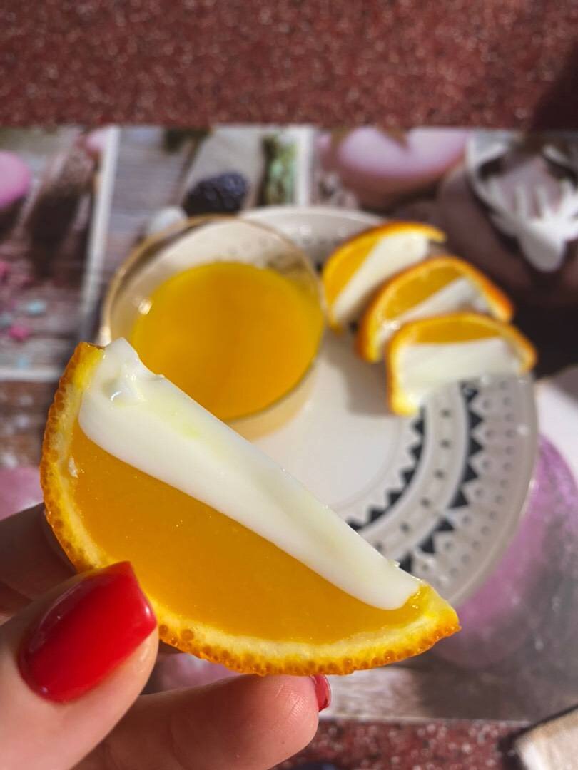 Разливаем в формочки из апельсиновой кожуры с остывшим апельсиновым желе. Ставим в холодильник. Как застынет, нарезаем острым тонким ножом на дольки. ПРИЯТНОГО АППЕТИТА!
