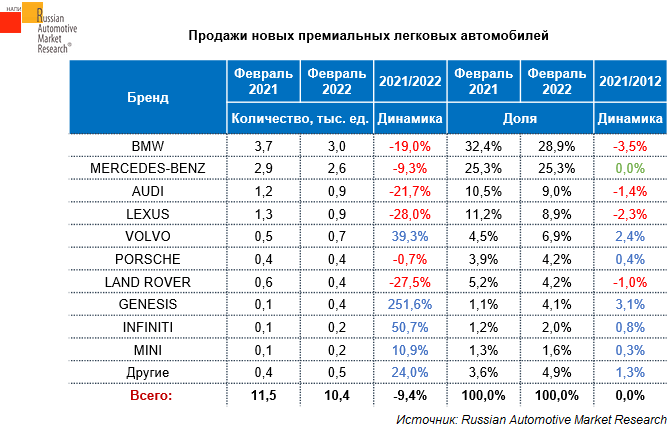Согласно данным Russian Automotive Market Researchпродажи новых легковых премиальных автомобилейза февраль 2022 г. снизились на 9,4% по сравнению с аналогичным периодом 2021 года. В феврале текущего года было продано 10,4 тыс. новых легковых автомобилей премиальных брендов, что составило 10,3% рынка. Доля премиального сегмента по сравнению с февралем прошлого года не изменилась. В феврале текущего года резко вырос спрос на GENESIS - на 251,6%. Пожалуйста, оцените эту статью и подпишитесь на канал или поделитесь ссылкой на него в социальных сетях, если считаете его интересным.