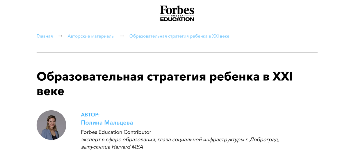 На сайте Forbes Education опубликована статья Полины Мальцевой (Forbes Education Contributor, эксперт в сфере образования, глава социальной инфраструктуры г. Доброград, выпускница Harvard MBA) о выстраивании образовательной стратегии для детей.