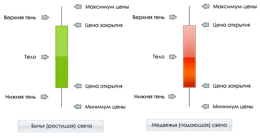 Как всё-таки наблюдать за изменением цены? В основе технического анализа лежат разные графики. Цены инструментов на рынке изменяются каждую секунду, как только новая котировка поступает в торговую платформу, она ложится в основу графика. Именно на нем мы наблюдаем изменение цены и делаем наши прогнозы. Основными видами графиков являются: · Свечной- рассмотрим чуть ниже; · Линейный- просто линия, которая позволяет быстро определить направление движения цены; · Бары- содержит в себе ту же информацию, что и свечной график, но имеет другой вид. Самым популярным является свечной график. Свечной график состоит из множества свеч, которые формируются по ценовым величинам: · Цена открытия: цена (с которой начинаются торги); · Цена закрытия (цена последней сделки); · Максимальная цена (самая высокая цена сделки); · Минимальная цена (самая низкая цена сделки); · Объем торгов (количество сделок за выбранный отрезок времени). По этим точкам в выбранном таймфрейме строится свеча: