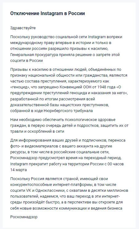 Да опечалена я. Инсту заблокировали. Мне конечно не инсту то и жалко. Ну вела я аккаунты, ну экспериментировала с дизайном, лентой. Развивала так сказать фантазию. Хромает она у меня, креативить не получается. Воспитана на классике, вот и при попытке свернуть в необычность, все как то не складно получается. Но не в этом суть дела то. Инста на пассиве у меня однако работала и... зарабатывала. Пока я работаю с заказчиком или своим блогом инста в фоновом режиме тоже работала. И последние очень красиво и прибыль. А вчера бац и сумма осталась прежней. Так у меня и фб, и твитер к проекту были подключены. И фсе пусто. Ребята с Роспотреба вы конечно молодцы, но от того что закрыли инсту вы не закрыли все то что мы все таки видим и в фб и в инсте и в твиттере. Да, да впн никто не отменял. Конечно придется это ставить и на комп, но не хотелось бы. Но придется. Так от чего на заблокировали если все наезды и хамство на Россию я вижу и читаю. Я конечно скажу сейчас жестоко но это правда. Что