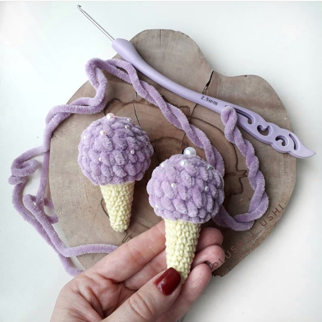 Нам понадобится⤵️ Пряжа: Рожок связан из ярн арт джинс. Мороженка - из плюшевой пряжи долфин бэби. Крючки: 2-2,5 для джинс. 2,5-3 для плюшки. ⠀ сбн - столбик без накида. пр - прибавка. уб - убавка. ⠀ Начинаем вязание с рожка из тонкой пряжи джинс. 1. 6сбн в кольцо амигуруми. 2. 6сбн. 3. 2сбн, пр, 2сбн, пр (8сбн). 4. 8сбн. 5. 3сбн, пр, 3сбн, пр (10сбн). 6. 10сбн. 7. 4сбн, пр, 4сбн, пр (12сбн). 8. 12сбн. 9. 5сбн, пр, 5сбн, пр (14сбн). 10. 14сбн ⠀ Делаем обвязку по краю. Но это необязательно) Затем переходим на плюш. Если делали обвязку, то первый плюшевый ряд вяжете за внутреннюю петлю ряда 10. Набиваем наполнителем по мере вязания. ⠀ 11. 14сбн. 12. (1сбн, пр)×7раз (21сбн). 13. 21сбн. 14. (1сбн уб)×7раз (14сбн). 15. 7 уб (7сбн). 16. 3уб, 1сбн. Зашиваем иголкой. ⠀ Маленький брелок-мороженка готов. Вяжите с удовольствием!