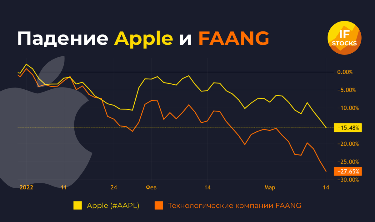 За последние сутки цена акций Apple (AAPL) снизилась примерно на 2,6%. Но почему? Последнее, что можно найти в новостях о компании — закрытие завода в Шанхае в связи с новой вспышкой COVID-19 в Китае. Город Шэньчжэнь ввел серьезные ограничения, и компании Foxсonn (тикер 2354), которая собирает продукцию Apple, пришлось приостановить предприятие. Какие будут потери для Apple, оценить сложно. Foxconn пытается нивелировать простои, перераспределив производственные процессы на резервные заводы. Впрочем, закрытие завода — скорее второстепенная причина, ведь акции Apple падают уже с начала года. В чем настоящая причина падения? В макроэкономике. Американский рынок сейчас испытывает давление, и индекс S&P 500 скорректировался от своих пиков уже на 14%. Это происходит на фоне повышенной инфляции 7,9% и ожиданий инвесторов по поднятию ФРС ключевой ставки 16 марта. В связи с этим около 60% процентов компаний из индекса S&P 500 находятся в падающем тренде и торгуются ниже 200-дневной скользящей с