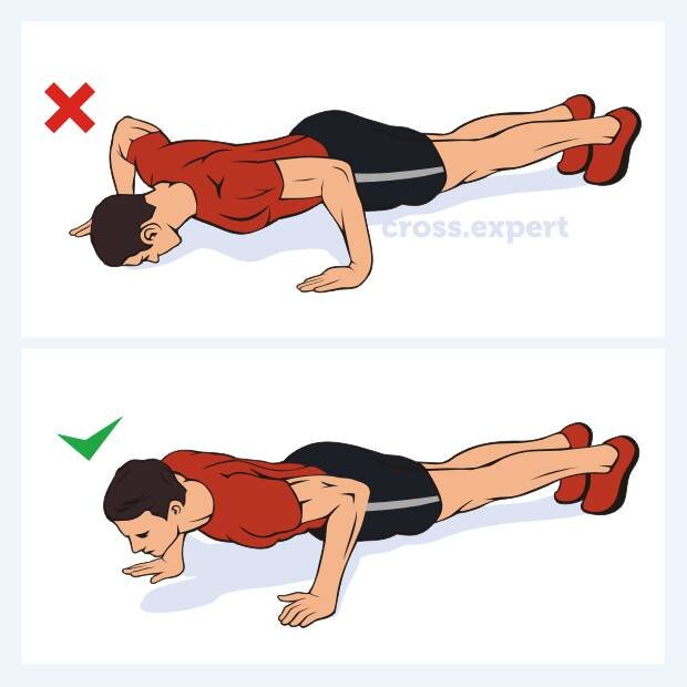 1.Тело образует прямую линию, таз не уходит вверх и не прогибается вниз 2.Мышцы живота напряжены, но дыхание не задерживается 3.Голова находится в нейтральном положении, не смотрит вниз, но и не задирается вверх 4.Ладони находятся строго под плечами, не выходят вперед 5.Ладони смотрят вперед, параллельно друг другу 6.Локти повернуты назад на 45 градусов, они не расставлены в сторону 7.На вдохе сгибаем локти и опускаем корпус параллельно полу, сохраняем прямую линию тела 8.Отжимания от пола выполняется с полной амлитудой, т.е. тело опускается максимально низко. 9.Локти должны образовывать прямой угол
