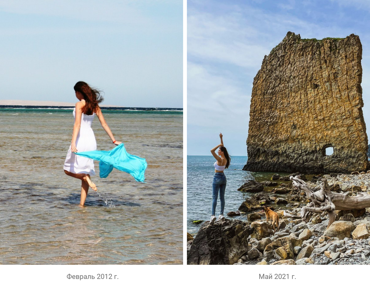 На волне нынешнего кочевничества всех авторов на разные площадки раскопала свою страничку Вконтакте. Это, пожалуй, была моя первая социальная сеть, и когда-то очень даже активная страница. Открывать переписки боюсь, а вот фотографии глянуть оказалось интересно. Глаз, конечно, от некоторых снимков почти задергался. Фотография всегда была моим увлечением, и как с точки зрения фотографа, и как модели. Искать ракурс, позировать, угадывать с антуражем и еще много секретов удачного кадра. Но и случайные снимки часто западали в душу, сохраняя самые искренние эмоции и моменты. Так вот, глядя на все это, так и захотелось провести эксперимент. Сопоставить свои фото "тогда" с похожими сюжетами "сейчас". Для чистоты эксперимента брала только фотографии из своего аккаунта Вконтакте за последние 10 лет и напротив фотографии со мной, сделанные за последний год. Фото на море Слева - одна из первых выложенных мной фотографий, Египет, отдых с семьей и друзьями, справа - майское автопутешествие по побере