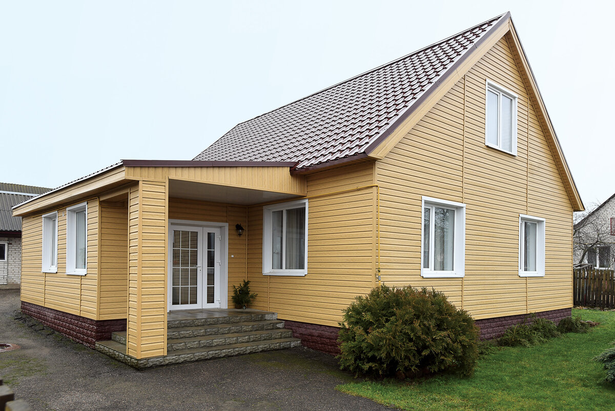 Сайдинг – это отдельные панели, которые очень удобно скрепляются между собой. Внешне отделка сайдингом похожа на дощатую обшивку. На каждой панели имеется замок-защелка и перфорированная кромка для гвоздей. Полосы сайдинга бывают разных размеров. Длина, как правило, варьируется от 2 до 6 метров, ширина 10-30 см, толщина до 10 мм. Профиль сайдинга выполняется в двух вариантах: «елочка» (одинарный перелом) или «корабельная доска» (двойной). На качество материала это никак не влияет, и выбирается профиль, только исходя из личных предпочтений. Фактура сайдинга чаще всего имитирует природную древесину. Для зашиты от ударов, царапин и коррозии используют специальное полимерное покрытие либо краску. Сайдинг сохраняет свои качества и первоначальный вид в течение нескольких десятилетий. Он отлично защищает здание от воздействия атмосферных явлений. Это очень легкий, удобный в применении материал, который прекрасно смотрится в любом ландшафте. Кроме того, сайдинг экологически безопасен и прос