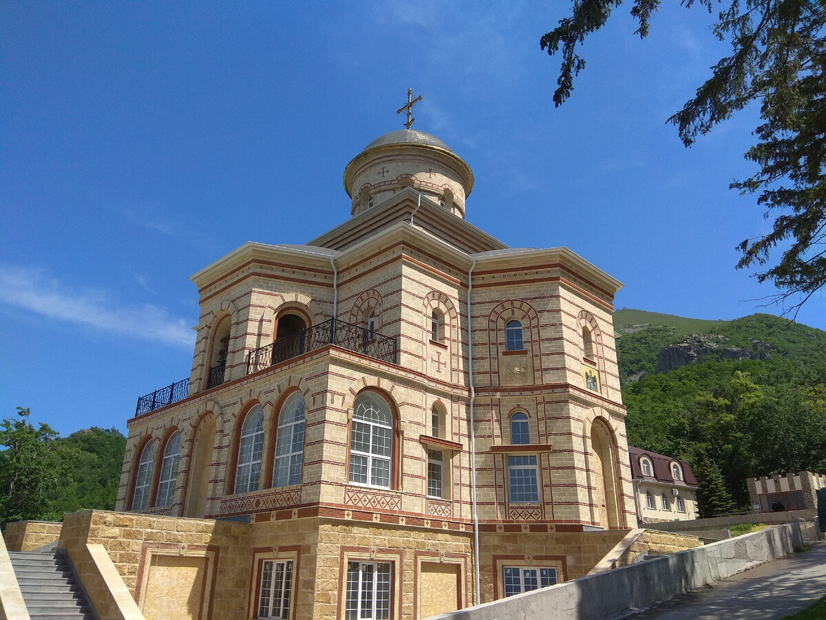 Здравствуйте, дорогие читатели. На дворе середина марта, на Кавминводах снег и морозы, но а я зову вас в тепло и зелень. Итак, 29 мая, тихий солнечный день, гора Бештау. Доехав из Пятигорска по асфальтированной дороге, ведущей к монастырю, я оставил машину на стоянке и решил посмотреть, что же там происходит поближе. Свято-Успенский Второ-Афонский Бештаугорский мужской монастырь расположился у кольцевой дороги вокруг горы Бештау. Территория большая и сейчас здесь достраивается новый храм. Вход во двор монастыря свободен, кроме посещения келий монахов. Здесь же есть и действующая церквушка. Вот она справа от храма. А это, собственно, само здание монастыря, где живут монахи. Вообще, территория монастыря очень красивая и ухоженная — здесь очень спокойно, тихо и много цветов. Здание нового храма тоже смотрится очень красиво. Но а мне пора двигаться дальше по кольцевой. Очень теплый день — почти лето, да и зелень уже полностью раскрылась, что создаёт густую тень в моей прогулке. Сама дорога