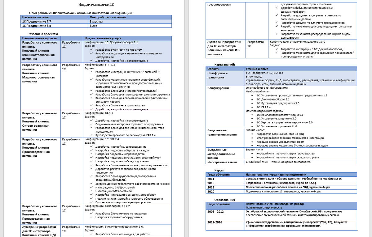 Обращаясь в аутсорсинговую компанию, клиент может выбрать, с какими специалистами работать. Хорошая практика, когда заказчику предоставляют проектные резюме сотрудников, где указаны их компетенции по 1С, опыт работы, образование, полученные сертификаты и пройденные курсы. С помощью проектных резюме клиенты отсеивают работников с нерелевантным опытом. С подходящими кандидатами заказчик может провести собеседование и дать им тестовое задание. Это поможет выбрать профессионала, с которым будет комфортно работать.