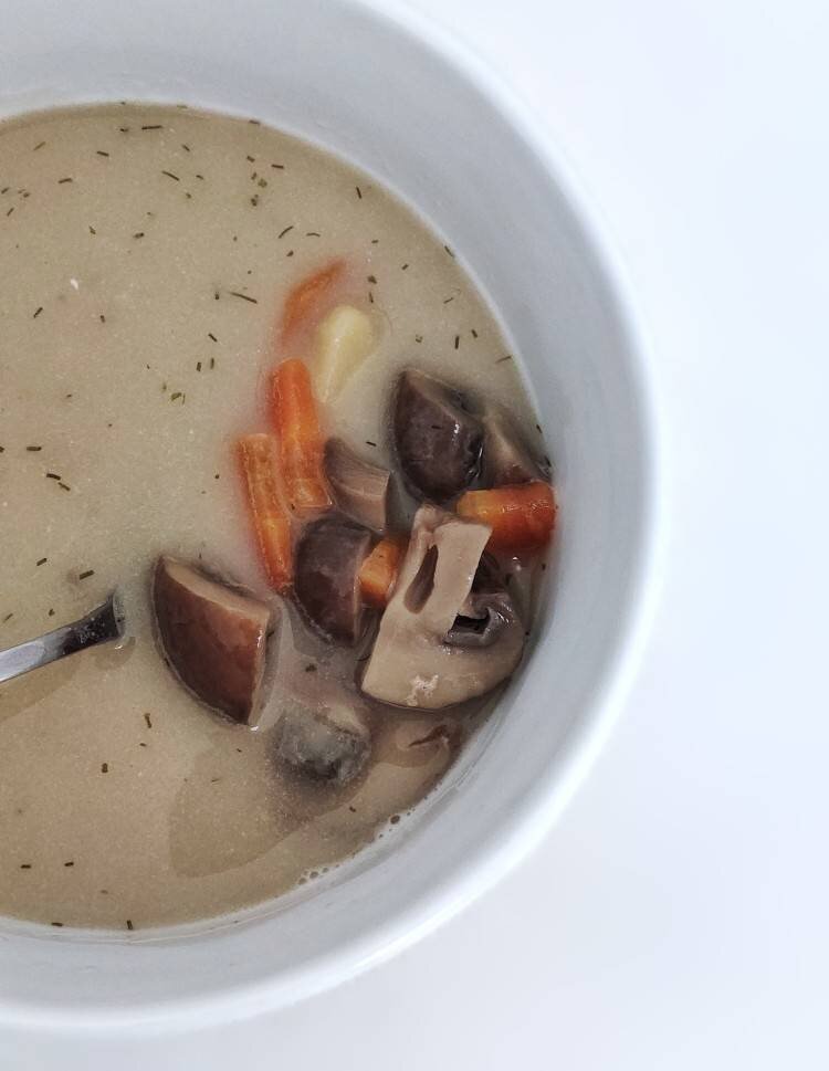 ~34 ккал 🥄 Ингредиенты: куриный бульон, гр шампиньоны (у меня королевские), гр (2 шт.) картофель, гр (1 шт.) морковь, (90 гр) сыр плавленый для супа (у меня с зеленью), грибной бульонный кубик, гр адыгейская соль Способ приготовления: Бульон. У меня бульон диетический. Постное мясо птицы залить водой, добавить целую луковицу, корнеплоды по желанию, лавровый лист и перец горошком. Посолить и варить 20-30 минут в зависимости от размера кусков мяса. По готовности избавить бульон от всего, что в нём было. Овощи и грибы нарезать произвольно. Закинуть в бульон сначала грибы, варить минут 10, следом закинуть овощи и варить вместе на медленном огне ещё минут 15. Сыр порубить на кубики и добавить в суп. Помешивать до полного растворения сыра в бульоне. Готово.