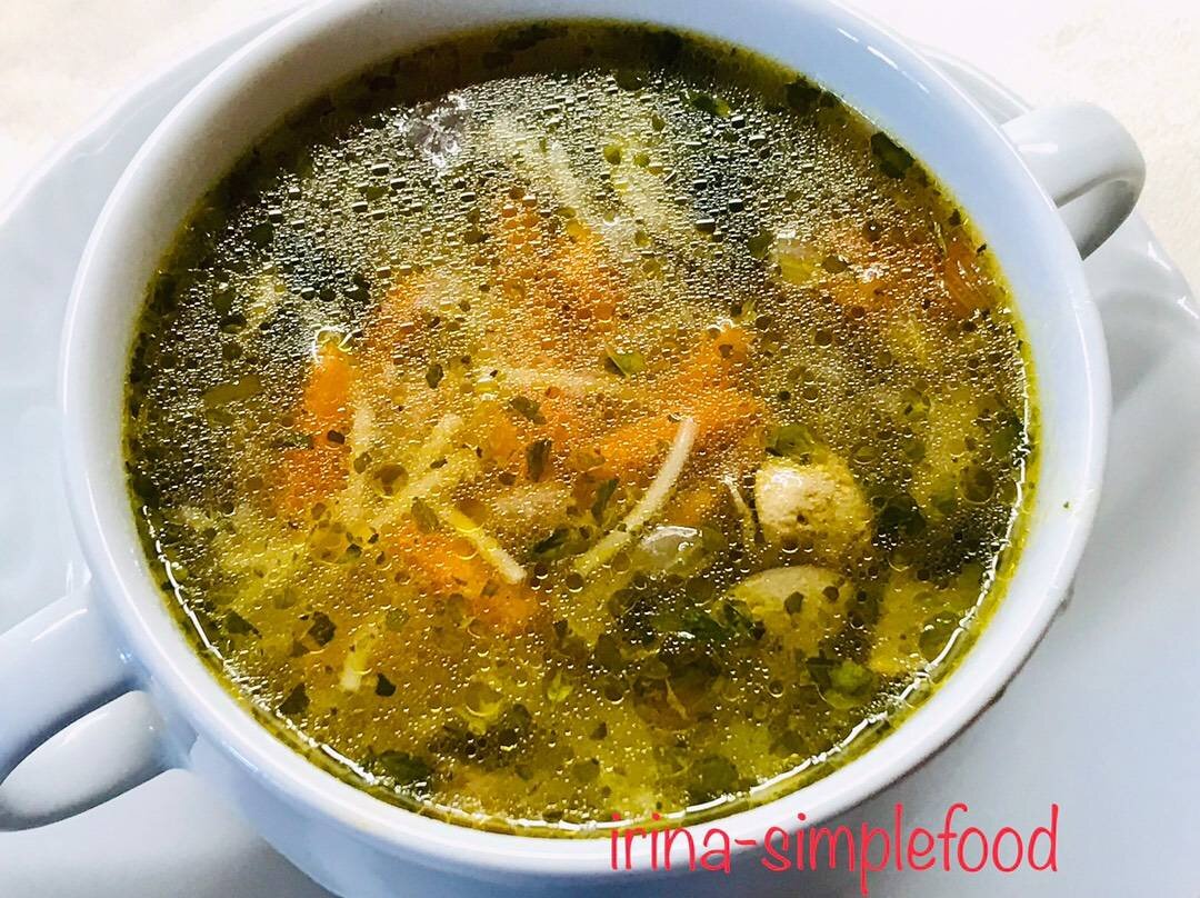 #пост #суп #вегетарианскиерецепты Вкусный супчик, сытный. Ингредиенты: шампиньонов, морковь 🥕, репчатый лук 🧅, сельдерея, вермишели, соль, чёрный молотый перец, лавровый лист, масло растительное для жарки, зелень сушеная, любая Способ приготовления: Подготовить продукты, овощи промыть, шампиньоны нарезать ломтиками, лук и стебель сельдерея мелко нарезать, морковь нарезать соломкой. В кастрюле с толстым дном с добавлением растительного масла спассеровать лук, добавить морковь и стебель сельдерея, пассеровать 4-5 минут. Залить овощи горячим кипятком, положить грибы и варить до готовности, в конце положить вермишель, лавровый лист, посолить и поперчить по вкусу, добавить сушеную или свежую зелень. Сразу подать на стол. Можно основу супа разделить на части, если готовить на 2 дня и тогда вермишель добавлять в каждую часть отдельно. Приятного аппетита 😋.