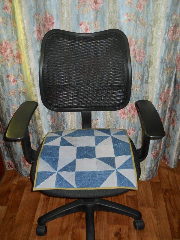 Сделать сидушку на стул не сложно. Можно попрактиковать использование разных лоскутных блоков. Для лучшего результата лучше брать контрастные цвета. Мои сидушки в основном из джинсовой ткани. Сидушка состоит из трех слоев. Верхняя или лицевая часть собирается из лоскутов в какой-нибудь рисунок. Внутренняя часть из синтепона или старого шерстяного одеяла или пледа. Нижняя часть из какой-нибудь тонкой ткани, можно взять хлопчатобумажные или подкладочные ткани. Швы на верхней части надо обязательно разутюживать, чтобы уменьшить толщину, и чтобы было легче отстрачивать или простегивать сидушку по швам. Рисунок верхней детали может быть любым, все зависит от цвета лоскутов и вашей фантазии. Но можно сильно не заморачиваться и сшить что-то простое, как, например следующая сидушка. Швы можно и не отстрачивать по всему изделию, а только закрепить по краю и в нескольких местах, чтобы слои не расслаивались. Окантовка делается руликом (косой бейкой) подходящего цвета. Обычно рулик выкраивается ш