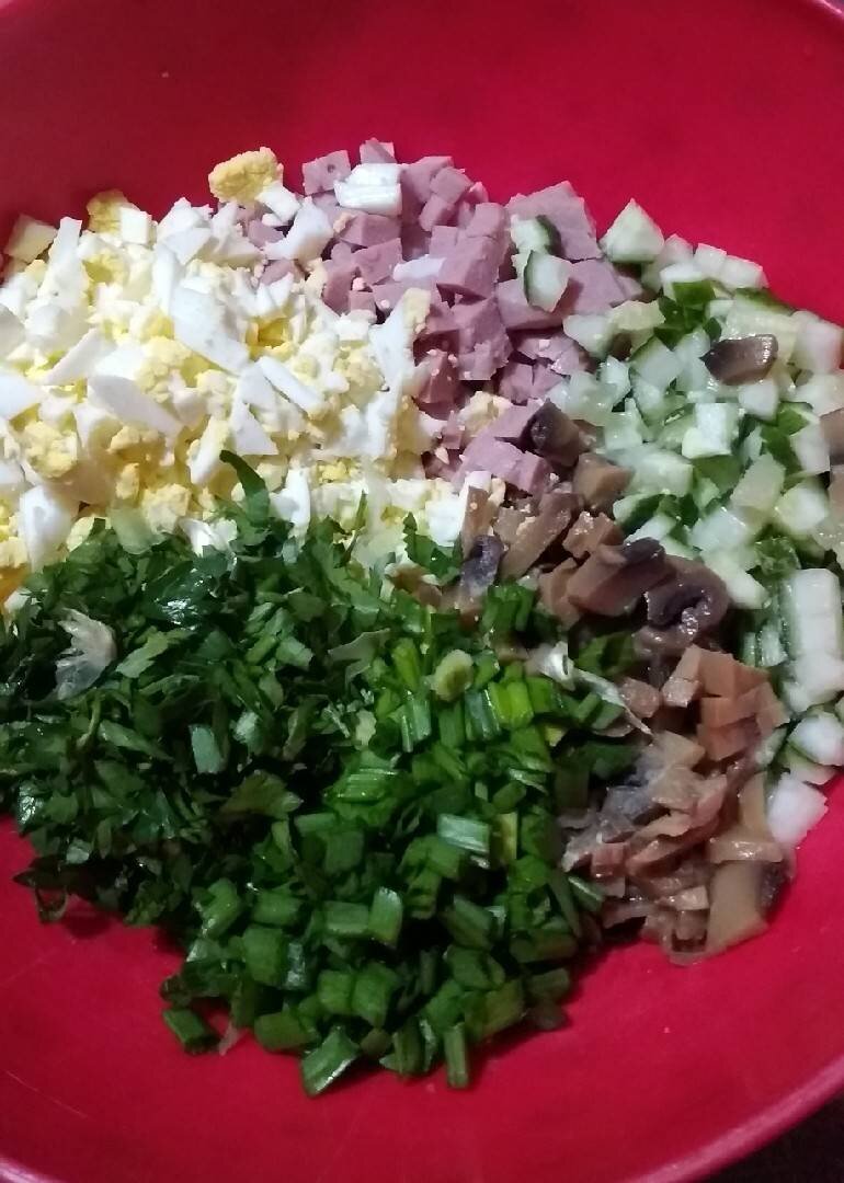 Очень вкусный салатик, стоит попробовать. Ингредиенты: яиц, ветчины, маринованных грибов, крупный свежий огурец, зелёный лук, петрушка, укроп, Заправка:, сметаны, лимонного сока, горчицы, соли , приправы, растительного масла Способ приготовления: Яйца помыть и сверить в крутую, отсудить и почистить. Приготовить заправку. В мисочке смешать сметану, лимонный сок, специи, соль, горчицу и растительное масло. Все продукты: огурец, яйца, колбасу, грибы, лук и зелень нарезать кубиками, заправить заправкой и перемешать. Приятного аппетита. 😊
