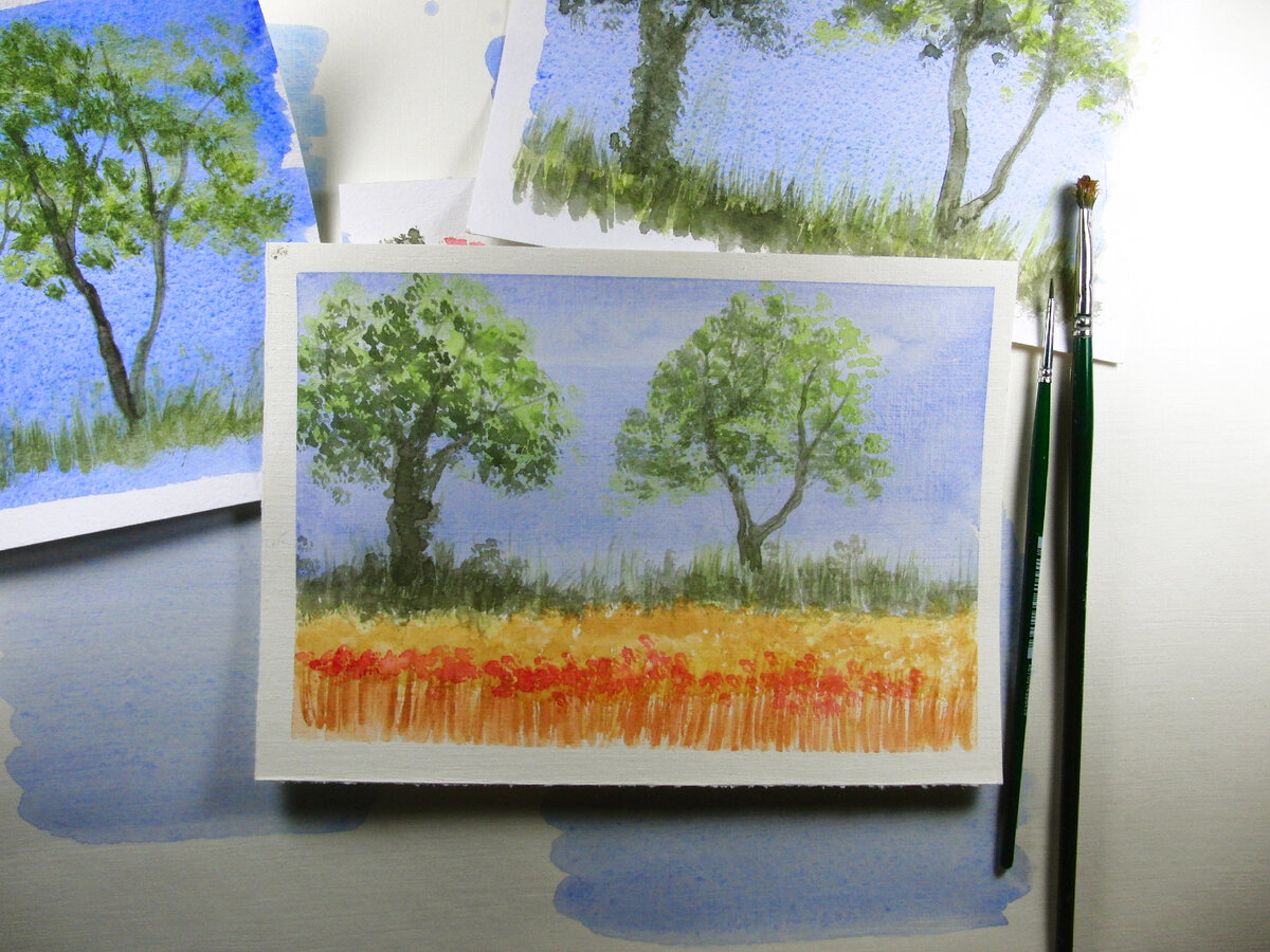 Всем привет! Предлагаю, сегодня снова потренироваться в творчестве. Как обычно, подобрала простое упражнение, которое можно повторять столько, сколько вам нравится. Для начала попробуем нарисовать одно дерево, но предварительного рисунка не будет. Это означает, что сразу пишем кистью. Для этого вам понадобится старая кисть, ей намечаем крону дерева. Краска наносится на сухую бумагу и каждый последующий слой лучше всего просушить. Когда нарисуете крону, то приступайте к рисунку ствола, но теперь возьмите тонкую круглую кисть. Сначала закройте ствол цветом, а когда лист высохнет можете прорисовать фактуру коры. Траву пишем полусухой старой кистью. Это упражнение очень простое и вы можете таким способом уже создавать пейзажи. Давайте попробуем создать композицию, смотрите ниже👇👇👇. Давайте создадим фон, возьмите ультрамарин и кадмий средний жёлтый. Старой кистью заполняем пространство цветом. Как вы заметили краску я наношу "тычками", а не лаконичным мазком. Краска оставляет след в в