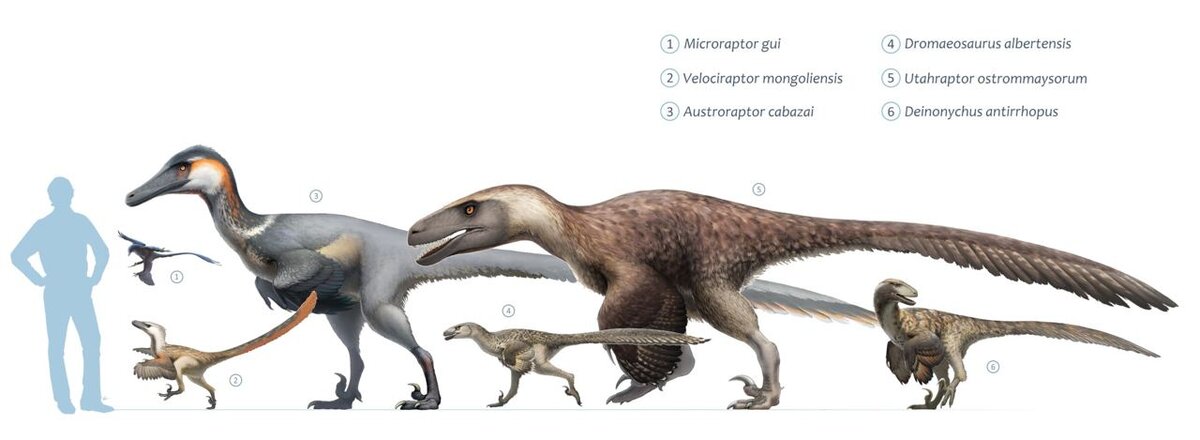 Вот так выглядели рапторы, а не так, как думала наука во времена первого фильма о Парке Юрского периода. Человек среднего роста рядом для сравнения. И, кстати, правильнее называть их манирапторами (от двух латинских слов «рука» и «хватать»). По одной из классификаций этот инфраотряд включает в себя птиц. Да, обычных птиц. А значит манирапторы – это единственная группа динозавров, дожившая до современности.#история #факты #динозавры