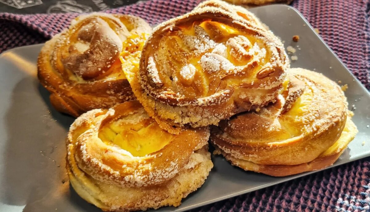 Мои первые в жизни плюшки с сахаром, и первое взаимодествие с дрожжами 😀 Рецепт "Плюшки-розочки": Ингредиенты: - вода 100 мл. (тёплая) - сухие дрожжи 7 гр. - сахар в тесто 2 ст.ложки - яйца 2 шт. - молоко 70 мл. - сливочное масло 60 гр.(растопленное) - сливочное масло 70 гр. (растопленное) - соль 1 щепотка - сахар полстакана - мука 450 гр. В тёплую воду добавляем дрожжи и сахар (2 ст. ложки), перемешиваем, накрываем полотенцем и оставляем, на 15 минут. В отдельной ёмкости смешиваем яйца и молоко, добавляем растопленное масло (70 гр.) и щепотку соли, перемешаем, дрбавляем дрожжевую смесь и муку, замешиваем тесто. Оставляем на 30 минут, опять вмешиваем, делим на 8-10 частей Раскатываем, мазываем каждую часть растопленным сливочным маслом и посыпаем сахаром Заворачивем в рулетик, сворачиваем рулетик чтобы края соединились и разрезаем вдоль не доконца, выворачиваем чтобы плюшка рассскрылась В разогретую духовку на 180° ставим на 25 минут Наливаем чай и наслаждаемся 🥰 #плюшкикаквде