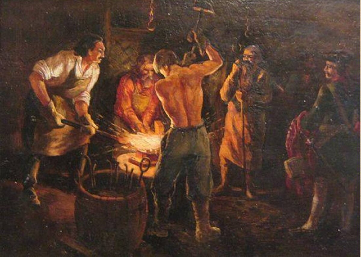 Однажды Петр I приехал на железоделательный и чугунолитейный завод Вернера Миллера и там пошел в ученики к мастерам кузнечного дела. Вскоре он уже хорошо стал ковать железо и в последний день своей учебы вытянул 18 пудовых полос железа, пометив каждую полосу своим личным клеймом. Окончив работу, царь снял кожаный фартук и пошел к заводчику. — А что, Миллер, сколько получает у тебя кузнец за пуд поштучно вытянутых полос? — По алтыну с пуда, государь. — Так заплати мне 18 алтын, — сказал царь, объяснив, почему и за что именно должен Миллер заплатить ему такие деньги. Миллер открыл конторку и вынул оттуда 18 золотых червонцев. Петр не взял золото, а попросил заплатить ему именно 18 алтын — 54 копейки, как и прочим кузнецам, сделавшим такую же работу. Получив свой заработок, Петр купил себе новые башмаки и потом, показывая их своим гостям, говорил: — Вот башмаки, которые я заработал своими собственными руками. Одна из откованных им полос демонстрировалась на Политехнической выставке в Мо