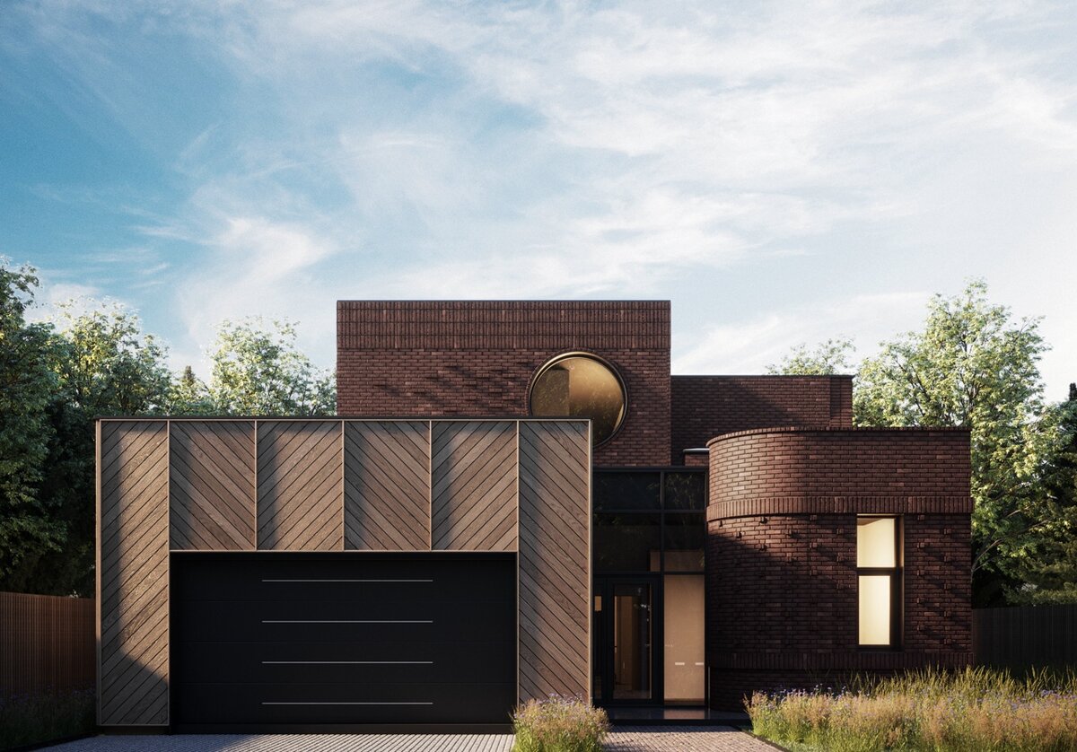 Заказчик пришел с желанием построить дом в современном стиле. Но его пугало, что в этой среде он будет как инопланетный корабль. Мы сразу же предложили попробовать на этом сыграть и назвали максимально гротескно «ХАЙ ТЕК ПО-ТУЛЬСКИ» Начали разрабатывать объемно-планировочные решения, узкий участок дал дому вытянутую форму. Зонирование сформировало 3 блока: гаражный, приватный , и двухсветный объем кухни-гостиной. Мы хотели сделать запоминающийся силуэт дома. Получилось три разновеликих блока и начали искать для каждого свой характер. Материалы отделки были очевидны: кирпич и дерево. Мы хотели «нарядить» дом отсылками, но при этом оставить дом стильным, остановиться в шаге от кича! Сначала собрали референсы русского кирпичного стиля.