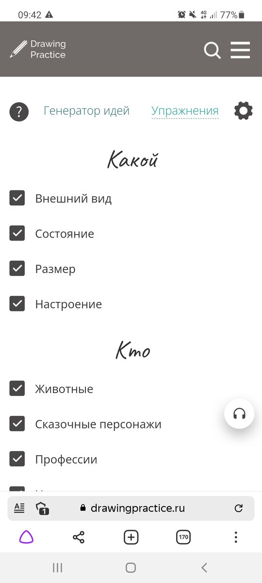 Сейчас существует множество сайтов с сервисами, предназначенными для облегчения художественного процесса Специально для Вас я организовала небольшую подборку. Начнём! 1. Этот сайт - генератор идей для Ваших рисунков. Не знаете что нарисовать - зайдите сюда. Здесь присутствует четыре вида настроек (чтобы их открыть, нажмите на значок шестеренки в правом верхнем углу сайта): Эти настройки позволят более точно подобрать идею на Ваш вкус. 2. Этот сайт - тоже генератор, но только другой - генератор палитр. Чтобы начать им пользоваться нажмите кнопку "start the generator" (перед этим согласитесь с использованием cookies). После недолгой загрузки, сайт выдаст вам палитру из пяти случайных цветов: Чтобы сгенерировать заново, нажмите кнопку "generate". Также здесь вы можете отменить действие или же наоборот - вернуть. 3. Этот сайт тоже английский, как и colors.co, но не пугайтесь. Например, в Яндекс Браузере есть функция встроенного перевода сайта. На данном сайте есть две настройки: Д