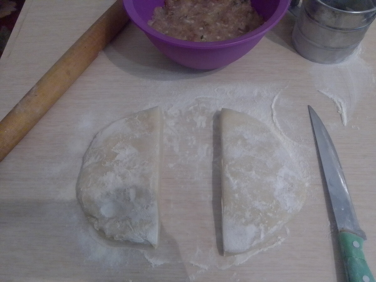 Подготовили тесто и разделили на две равные части обе половинки раскатываем, одну убираем в сторону делаю кружочки на тесте стопкой, чтоб было удобно выкладывать начинку выложили фарш и накрываем второй половиной теста, вырезаем стопкой наши пельмешки