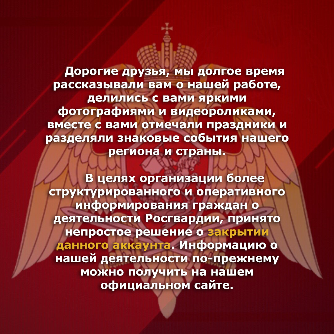 Друзья, мы ценим вашу искреннюю поддержку и предлагаем встречаться на официальном сайте Росгвардия Иркутская область https://38.rosguard.gov.ru и….. на аккаунтах Сибирского округа Росгвардии. Теперь полюбившиеся вам публикации о нас будут появляться на этих площадках: ВК: https://vk.com/rosgvardsibirofficial Телеграмм: https://t.me/RosgvardSibirOfficial Дзен: https://zen.yandex.ru/rosgvardsibirofficial