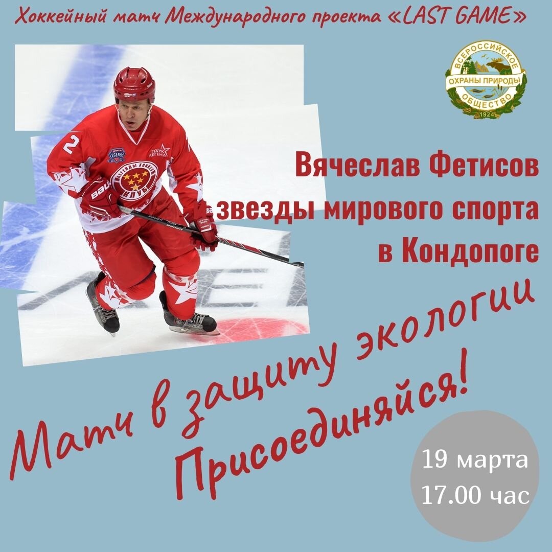 Председатель Всероссийского общества охраны природы, посол доброй воли ООН, двукратный олимпийский чемпион Вячеслав Фетисов проведет в Карелии хоккейный матч Международного проекта «LAST GAME». Мероприятие приурочено к 97-летию ВООП – старейшей и самой массовой в нашей стране общественной природоохранной организации. Вместе с Вячеславом Фетисовым на лед выйдут прославленные хоккеисты Алексей Касатонов, Андрей Коваленко, Алексей Гусаров и Вячеслав Буцаев. В состав команды «Карелия» войдут как ветераны хоккея, так и воспитанники детской хоккейной школы «СКА-Карелия». Матч начнется в 17.00 час 19 марта в Ледовом дворце Кондопоги. Вход свободный. Инициатива Вячеслава Фетисова «LAST GAME» направлена на привлечение внимания к экологическим проблемам и предусматривает проведение серии игр с участием легенд хоккея, политических деятелей, звезд кино и музыки, а также других известных людей. Матчи ранее прошли в Финляндии, Кении, ОАЭ, Израиле, Нью-Йорке, Шотландии, Сингапуре, на льду озера Байка