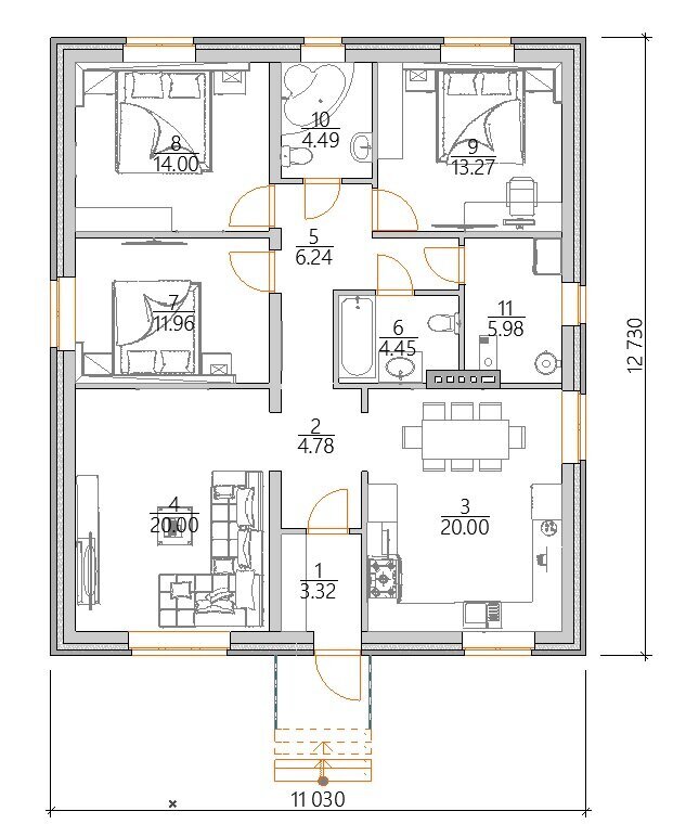 АРХИПРОЕКТ.РФ проект №42 Преимущества данной планировки: — 3 спальни в 108 кв м — раздельная кухня и гостиная — простая и экономичная форма дома — две ванны и котельная Внешний вид этого проекта Вы можете посмотреть по этой ссылке АРХИПРОЕКТ.РФ Бюджетный дом площадью 108 кв м. Эффектный архитектурный облик дома гарантирует восхищенные взгляды окружающих! А вы сами тоже будете в восторге от этого дома! Обрамление оконных проемов темным кирпичом дает больше контрастности проекту. АРХИПРОЕКТ.РФ Конфигурация дома прямоугольная. Это уменьшение расходов на строительстве стен и монтаже кровли. Вход в дом через тамбур, в котором можно разместить большой шкаф. Далее можно последовать в небольшой холл, и коридор. Гостиная и кухня разделены, три спальни оптимальных размеров. Два санузла и котельная имеют смежную стену с кухней, соответственно, одну вентшахту. Два санузла позволяют разместить необходимую технику и избавят от очередей. Пожалуйста, напишите Ваше мнение о проекте — это важно! :)