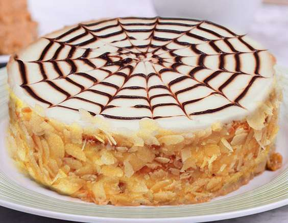 9. Растопите темный шоколад и смешайте с одной столовой ложкой сливок. Слегка остудите и поместите в кондитерский мешок. Нарисуйте спираль, начиная из центра. Зубочисткой проведите линию от центра к краю, разделив торт сначала на 4 части, затем каждую часть ещё на 4 части. Украсьте боковые поверхности миндальной стружкой, охладите в холодильнике 2 часа и торт готов