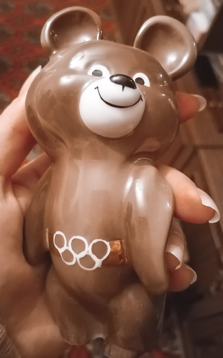 Важнейший год в истории социалистического государства, конечно же 1980! Потому что 3 августа этого года были открыты XXII летние Олимпийские игры. А символ этих игр, олимпийский мишка, до сих пор вызывает у всех тёплые и приятные эмоции. Даже у тех, кто ту олимпиаду не застал. Нет у меня к сожалению его изображений, но часто встречаю у друзей и знакомых. 😍😍😍 Вот к примеру экземпляр статуэтки дулевский, который встречается ещё с когтями. Этот как видите не опасный. 😁 Таких же медведей делали и на других фарфоровых заводах. Буди, вербилки, и другие. Коллекционирование именно олимпийский медведей, очень популярно. 😉 А история этого медведя символа началась в 1977 году, когда в телепередаче "В мире животных", (вёл её тогда не наш земляк) Василий Песков предложил телезрителям выбрать талисман предстоящей олимпиады. Союз художников был завален письмами, вариантов с зарисовками было около 45 тысяч, но все было не то. Однозначно было только одно — символом может быть только русский