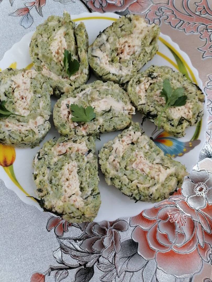 #меню #закуска #готовимсами #приятногоаппетита Ингредиенты: замороженной брокколи, тунца, творожный сыр \ из замороженного кефира\, яйца, укропа, соль, муки Способ приготовления: Брокколи разморозила ночь в холодильнике. Вода в кастрюле закипела немного подсолила и опустила туда брокколи на 2 минуты. Слила на дуршлаг и пропустила через мясорубку \ можно на блендере\. Взбиваем яйца в хорошую пену. Соединяем все ингредиенты мука+ яйца + брокколи \ можно чуть подсолить \аккуратно перемешиваем и выкладываем на пергамент ровным тонким слоем. Выпекаем 15-20 минут смотрим по своей духовке. Аккуратно сворачиваем в рулет и даем полностью остыть. Тунец разминаем вилкой до мелкого состояния. Смазываем рулет сначала сыром \ творожным \ стараемся ровным слоем сверху тунец меленько размятый. Снова заворачиваем туго в рулет и отправляем в холодильник желательно на ночь или часа на 3. Мелко нарезаем укроп и весь наш рулет обсыпаем. Очень вкусная закусочка получилась. ВСЕМ ПРИЯТНОГО АППЕТИТА. Заходите