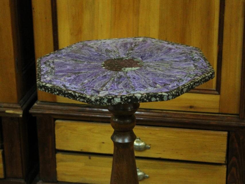 №дар Л.И. Шабалина 2016 г. Все представленные в экспозиции Минералогического музея предметы имеют отношение к геологии. Не является исключением и столик из чароита. Чароит − редкий минерал, который добывался только на одном месторождении в мире. Оно располагается на реке Чаре, протекающей по территории Забайкальского края, Иркутской области и Якутии. Сейчас, однако, там не шумит техника, и не взвиваются в воздух облака пыли − минерала осталось так мало, что разработка месторождения была запрещена. Чароит используют в ювелирном деле, из него делают вазы, браслеты, глобусы, шкатулки, пресс-папье, скульптуры… Камень использовался и в оформлении станций метро, например, московской «Тимирязевской». В Минералогический музей столик поступил от доктора геолого-минералогических наук Леонида Ивановича Шабалина в 2016 году. Источник https://museum.tsu.ru/ #музеи #тгу #томский государственный университет #коллекции #Минералогический музей #томск #минералы