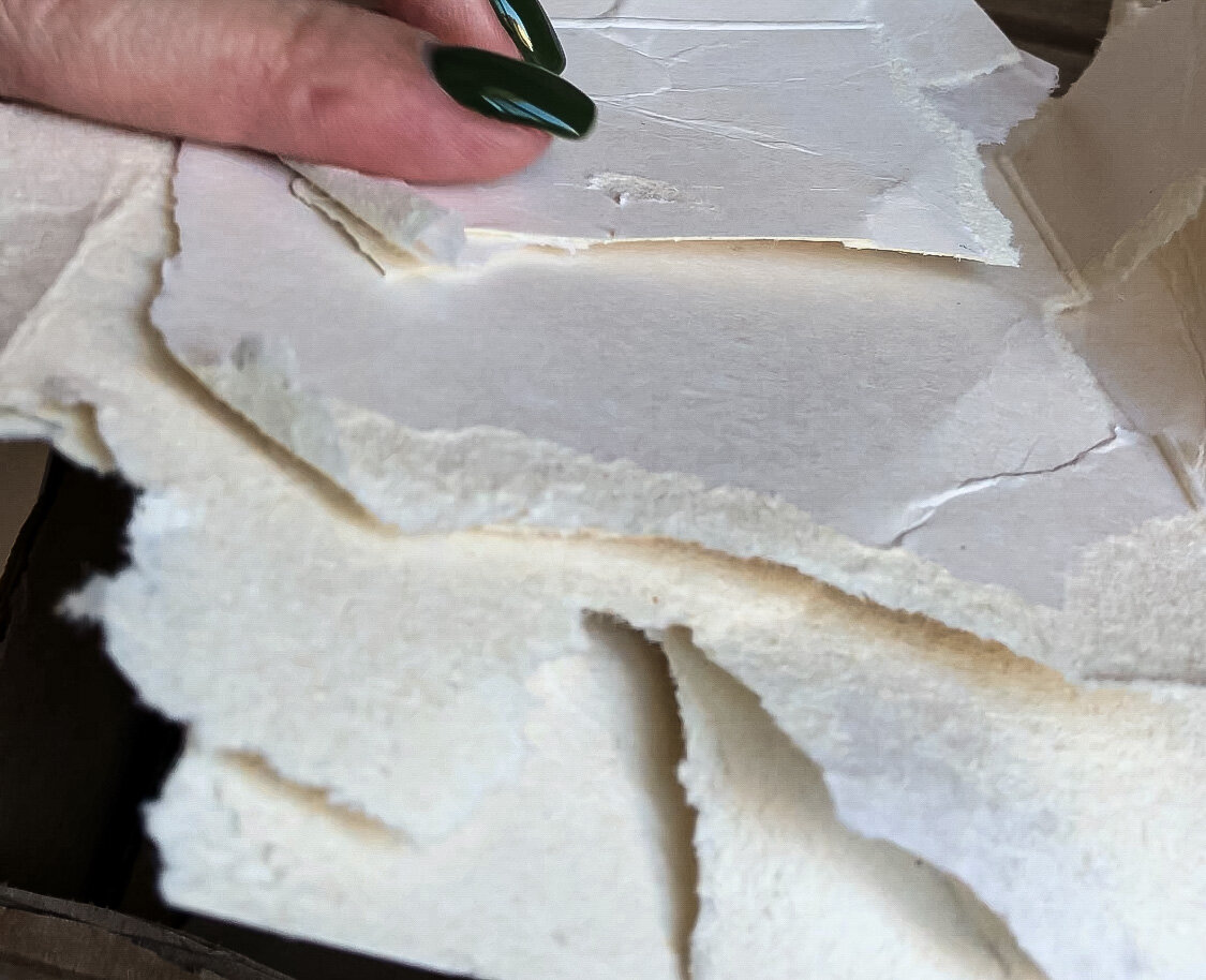 Я делаю свою бумагу исключительно из бумаги. Это могут быть картонные упаковочные крафт коробки и коробки от бытовых и пищевых продуктов, также списанные офисные листы, обрезки от дизайнерской бумаги. В общем вся макулатура, которую мы привыкли отправлять в мусорную корзину. Первым делом необходимо удалить из бумаги не растворимые полимерные покрытия (верхний плёнчатый слой, ламинация, клеевые участки) который не растворится в воде. И всяческие металлические включения. (скобы, скрепки) Затем измельчаем и замачиваем в ёмкость с водой не менее чем на четыре часа, а лучше на 12. Следующий этап измельчения. С помощью блендера измельчается макулатурное сырье, бумага расползается на волокна и таким способом у нас образуется пульпа. Полученную пульпу, разведя с водой, 1 к 9, мы можем формировать бумажное полотно. Для формирования будущих листов нужны две заготовки в виде рам подходящего размера. Одна рама обтянута сеткой, а вторая рама представляет собой каркас барьер при наложении на ра