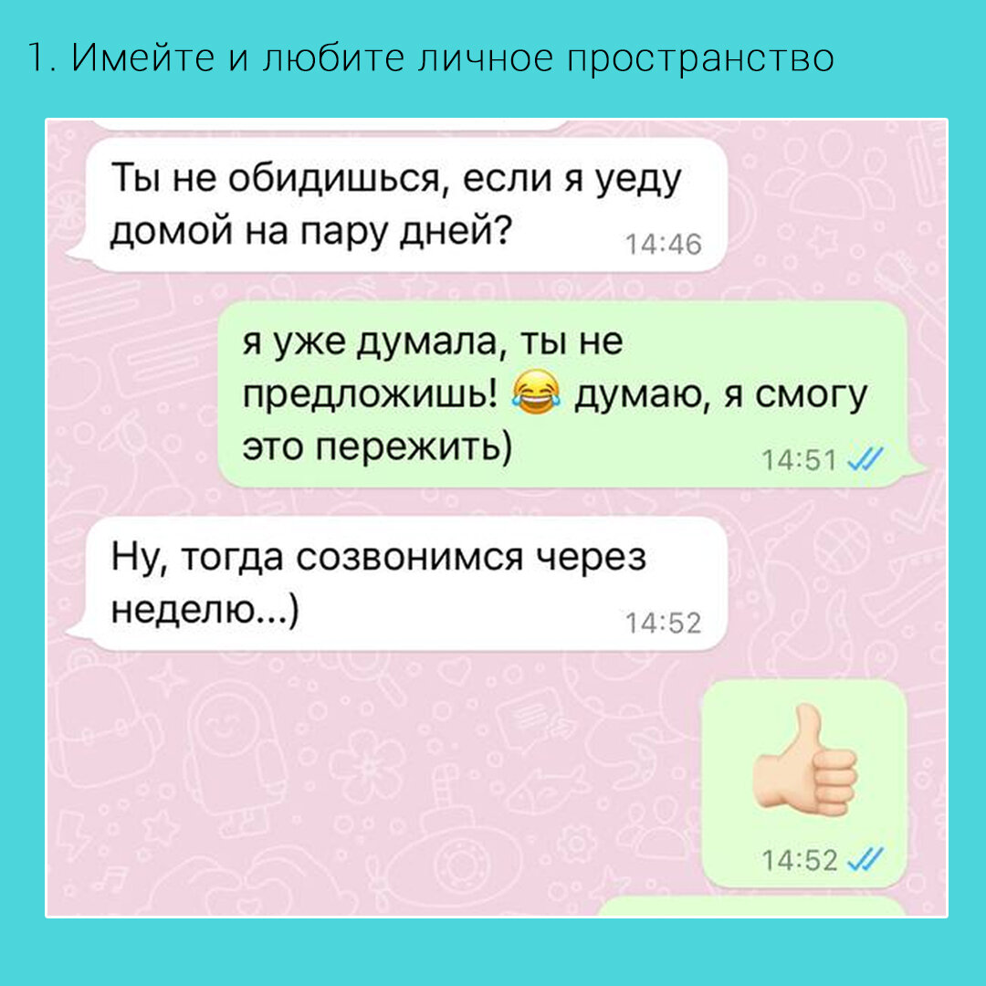 Самое лучшее, что можно иметь в жизни – это взрослые и здоровые отношения. Я вам приготовила мемчики из переписок, растаскивайте в сторис, и не за забудьте про сердечко, чтобы мои посты не пропали из ленты. Имейте и любите личное пространство Прекрасно, если у вас есть возможность разъезжаться или проводить время отдельно. Потому что именно так мы получаем важный опыт, узнаем себя, следуем желаниям и набираемся интересной информации, которую потом можно обсудить с партнером. Забудьте о прошлом Если ваши отношения могут разбиться о «кофе с бывшим», возможно стоит задуматься: нужны ли вам отношения, в которых вы не уверены? Я искренне верю, что ни бывшие, ни нынешние не могут влиять на взрослого человека. Если вы с бывшим сумели сохранить (человеческую) близость, значит ваша психика стабильна. Обязательно говорите! Это уже не секрет, но многие пары избегают конфликтов, замалчивая и стесняясь выражать чувства. Ищите свои способы говорить о проблемах, старайтесь быть честными, но корректн