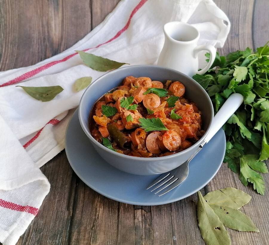 Ингредиенты: капусты, морковь, луковица, сосисок, маринованных огурца, томатной пасты, воды, лавровых листа, соль, перец, растительное масло Способ приготовления: Морковь и лук очистить, лук мелко нарезать, морковь натереть на крупной терке. Огурцы натереть на крупной терке. Капусту мелко нашинковать, сосиски нарезать. В мультиварку налить немного масла, включить режим "Жарка". Добавить лук, морковь и обжаривать примерно 5 минут. Добавить сосиски, готовить еще 5 минут. Добавить огурцы, перемешать, готовить еще 5 минут. Добавить капусту, влить воду, положить томатную пасту, лавровые листы, посолить и поперчить по вкусу. Все хорошо перемешать. Включить программу "Тушение" и дождаться окончания программы.